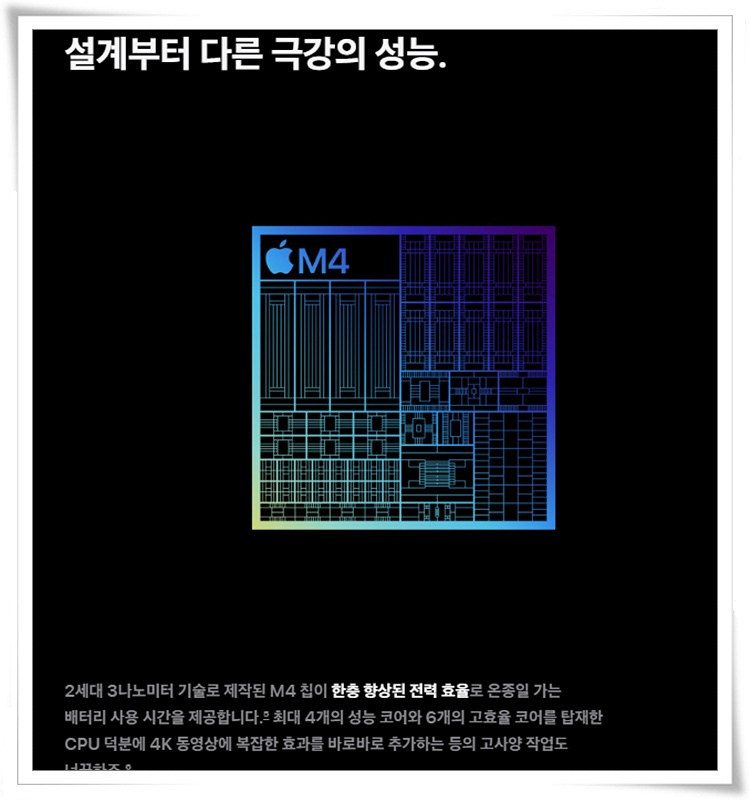 얼마 전 chat GPT-4o의 출시 이벤트에 사용된 시범용 기기들이 모두 애플 제품이었는데 그 연장선에 M4칩이 있습니다. 완벽한 인공지능 구현을 위한 성능이 필요하기 이번 아이패드 프로 7세대에 M4칩이 절대적으로 필요하지 않았을까 생각하게 됩니다. WWDC를 통해 보여준 애플이 준비하고 있는 인공지능이 좀더 우리의 삶 속에 가까이 와 있음을 느끼게 됩니다.